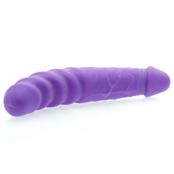 Highly elastic double dildo with two differently stimulating ends: one end in penis shape with prominent veins, the other one with stimulating grooves. Purple.