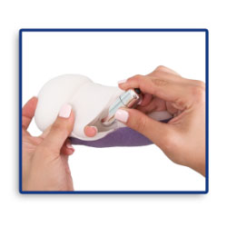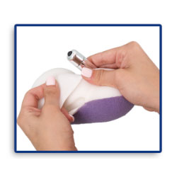 DISCREET design leave it in shower or bath. Single speed push button bullet easily slides into center channel in middle of sponge. Elastic strap snugly fits hand to keep it in place. Vibration carries throughout material great for sensual massage and or masturbation