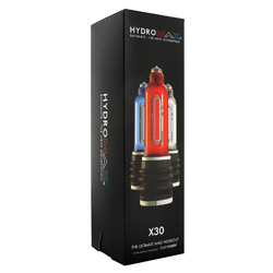 The Bathmate Hydromax X30 is the ultimate in hydro technology for penis development and health. Size 29 cm tall uncompressed, 22 cm tall when compressed, 5 cm diameter. Introducing the new revolutionary concept in penis development. The Bathmate Hydromax X30 is the ultimate in hydro technology for penis development and health. Does all the Bathmate Hercules does and more. Hydromax generates 35 percent more suction force than the Bathmate thanks to its unique, newly designed Bellows Pump system, providing you with better, faster gains. The Bellows system now incorporates a new soft sealing, full support comfort ring to give you reduced pressure and greater comfort around the penis base and testicle region. As an added bonus, it is also removable for ease of cleaning. A new Swivel Bellows feature allows for full 360 degree positive rotation to give you full visual chamber viewing plus inclined angle change option for optimum efficiency when used in the bath or shower or when you are using the amazing new Hydromax pleasure ring system. A new Super Flow Latch Valve system allows for single hand filling in the shower, making using and positioning the hydropump much easier for you. A new metric and imperial guidance scale gives you improved visual viewing area, plus upper and lower texturing on the vacuum tube for better grip and control. The internal bellows size has been increased and the number of convolutes reduced to allow you to gain even more impressive girth expansion.