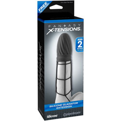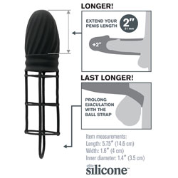 The Silicone Gladiator Extension is the perfect weapon for combatting your performance problems! With the snug cock cage wrapped around every inch of your manhood, you'll maintain rock hard erections and prolong the fun while you stimulate your partner. Your lover will enjoy deeper penetration and added thrills with the swirled 2 inch extension at the tip, while the ball strap prolongs your ejaculation for explosive climaxes. You'll enjoy thick, throbbing erections and your partner will love the cage's added sensations.