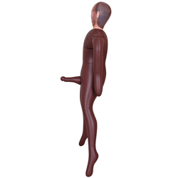 Black, male love doll with a firm penis, printed face, dark hair and printed chest hair. His mouth is closed, but he has a nice and tight anus. Inflatable to life size.