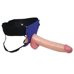 The Cushion Harness, made of a soft, purple foam rubber that covers the pubic area, holds the 9 inch cock in place, as well as a variety of flared base dildos. The wide elastic waist and leg straps are sturdy, but don't bind or chafe. The foam rubber front feels great for the wearer, the plushness providing wonderful cushioning for both of you during penetration your inner thighs and pelvic areas won't be irritated or marked. The straps on this harness have quite a bit of stretch, comfortably fitting up to a 40 inch waist.