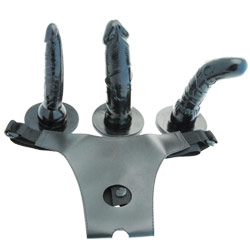 Black buckle on set of four pieces for HER and HIM or HER and HER. Enjoy the refined role games and give way to your lust and imagination. Three black dildos natural shape, slim design particularly suitable for anal pleasure and bent dildo for stimulation of the G-point plus ouvert string adjustable in size for the perfect wearing comfort.